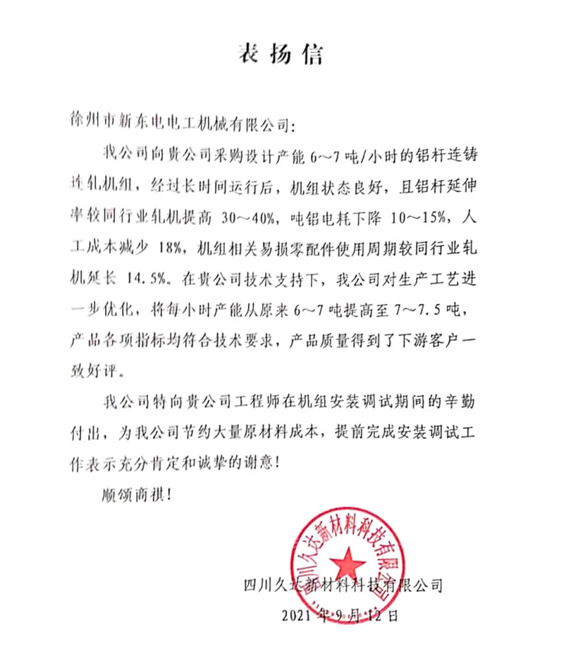 我公司向貴公司采購設(shè)計(jì)產(chǎn)能6~7噸/小時(shí)的鋁桿連鑄連軋機(jī)組,經(jīng)過長(zhǎng)時(shí)間運(yùn)行后,機(jī)組狀態(tài)良好,且鋁桿延伸率較同行業(yè)軋機(jī)提高30~40%,噸鋁電耗下降10~15%,人工成本減少l8%,機(jī)組相關(guān)易損零配件使用周期較同行業(yè)軋機(jī)延長(zhǎng)14.5%。在貴公司技術(shù)支持下,我公司對(duì)生產(chǎn)工藝進(jìn)一步優(yōu)化,將每小時(shí)產(chǎn)能從原來6~7噸提高至7~7.5噸,產(chǎn)品各項(xiàng)指標(biāo)均符合技術(shù)要求,產(chǎn)品質(zhì)量得到了下游客戶一致好評(píng)。
