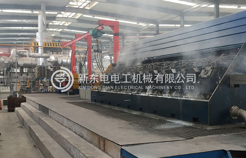 本設備采用新型四輪式連鑄機和連鑄連軋工藝生產(chǎn)¢9.5mm的鋁合金桿 (鋁合金牌號為1系列全部,3系列全部,6系列,8系列),鋁合金桿生產(chǎn)中,感應加熱器保證鑄坯進軋的工藝溫度要求,具有鑄錠加熱調(diào)節(jié)功能,連軋機具有主動喂料和堆桿停車功能,連續(xù)淬火裝置有在線淬火功能,收線導管出口處裝有吹水裝置,以清除鋁合金桿表面水分,同時安裝有主動牽引裝置,保證鋁合金桿的順利導出。圓弧導向管采用滾輪導向結(jié)構,減少鋁合金桿表面擦傷。繞桿方式為離心甩頭式,一方面使鋁合金桿在進入收線框前給予預變形;另一方面使其在軋制過程中若發(fā)生斷桿,桿尾能自動到收線框內(nèi)。使其換盤時不亂桿,以保證連續(xù)雙盤成圈裝置進行收線。
