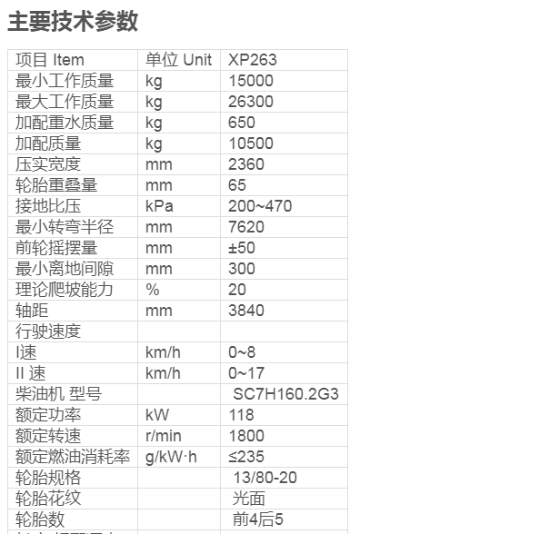 XP263型輪胎壓路機(jī)是根據(jù)市場要求而生產(chǎn)的大噸位輪胎壓路機(jī),它以充氣輪胎為工作裝置對鋪層材料施以壓實(shí),主要適用于瀝青路面、基礎(chǔ)層、次基礎(chǔ)層、大壩及填方工程等的壓實(shí)作業(yè),是建設(shè)高等級公路、機(jī)場、港口、堤壩及工業(yè)建筑工地的理想壓實(shí)設(shè)備。